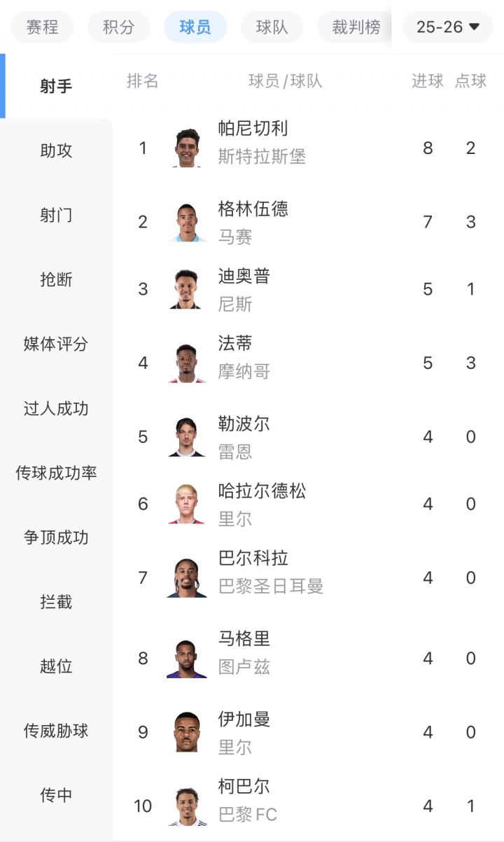 10月27日讯 法甲第9轮,斯特拉斯堡客场1-2遭里昂绝杀,尽管输球,但阿根廷前锋帕尼切利头球破门,以8球领跑法甲射手榜,力压格林伍德。
