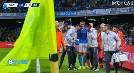 那不勒斯对阵国米比赛中,迪洛伦佐禁区内倒地造点,德布劳内点射破门,但射门时拉伤,随后被队医搀扶下场。