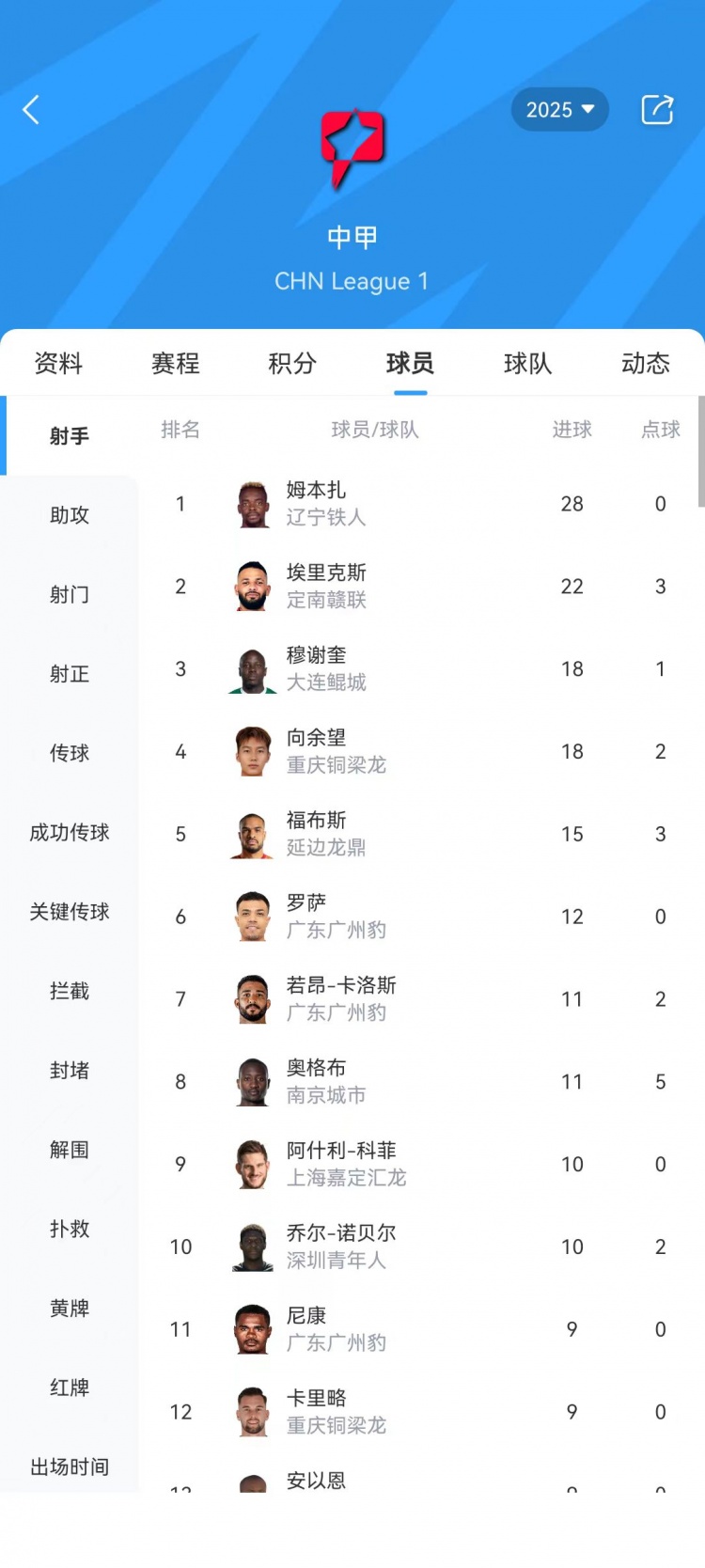 10月27日讯 中甲第28轮战罢,射手榜方面,姆本扎以28球领跑,本轮打进两球的埃里克斯排在第二,穆谢奎、向余望和福布斯分列三至五位。