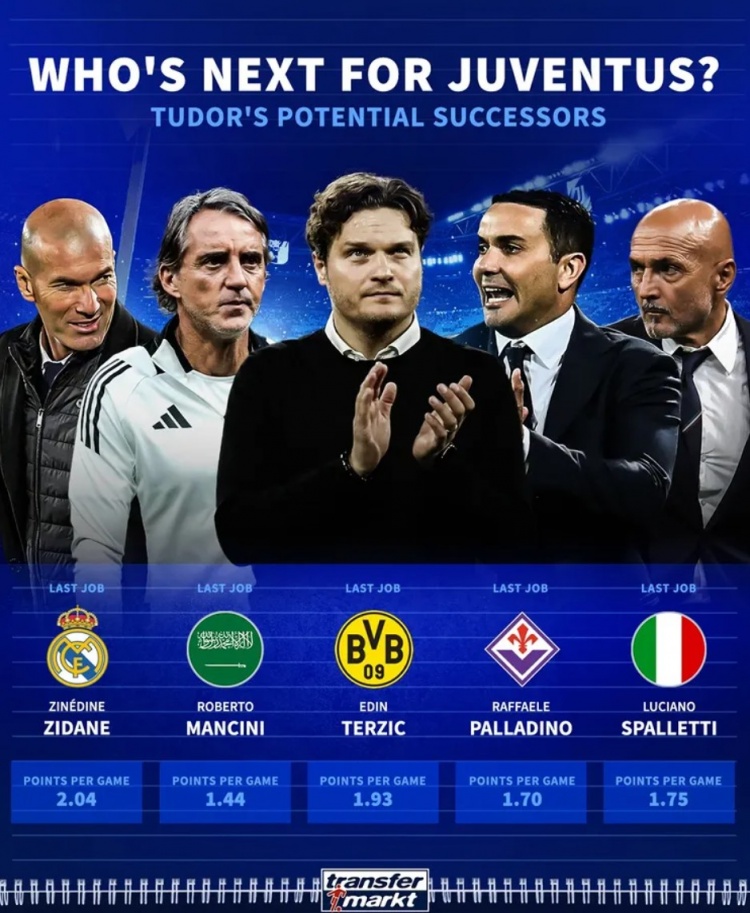 10月27日讯 尤文俱乐部今日已经通过官方宣布,解雇47岁主帅图多尔。《转会市场》也预测了几位尤文新帅热门候选,并列出了他们的上一次执教球队和场均拿分。