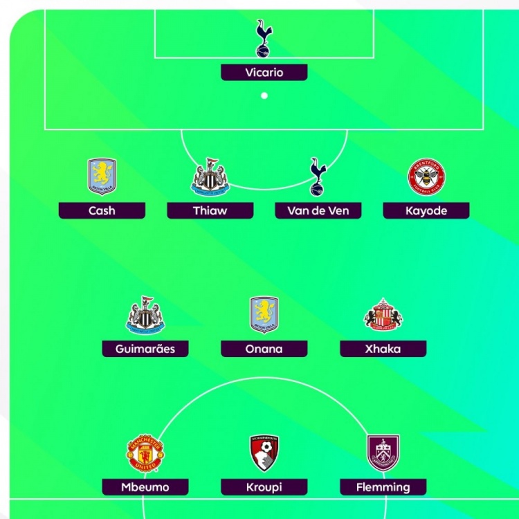 后卫:卡什(阿斯顿维拉)、佳夫(纽卡斯尔)、范德芬(热刺)、迈克尔-卡约德(布伦特福德)