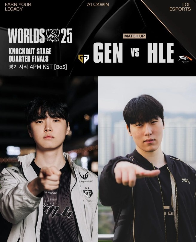 10月28日讯 LCK官推发文预热2025全球总决赛八强赛GEN vs HLE;