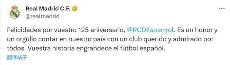 皇马官方社媒写道:“祝贺西班牙人迎来成立125周年纪念日,能拥有这样一家深受全民喜爱与敬仰的俱乐部,是我们国家的荣幸与骄傲,你们的传奇历史为西班牙足球增添了光彩。”