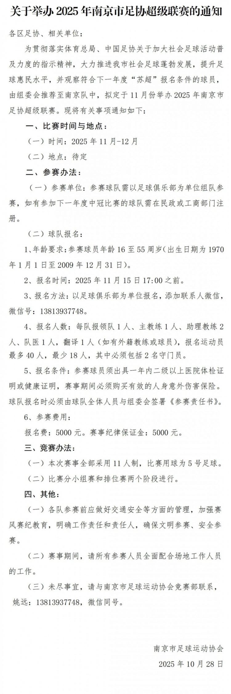10月28日讯 今日,南京足协发布消息,拟定于2025年11月举办南京市足协超级联赛,旨在推进城市社会足球蓬勃发展,并观察符合下一年度“苏超”报名条件的球员。