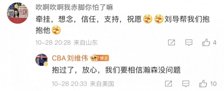 在这条动态下,刘维伟还和网友们进行了一些互动,一名网友表示:“牵挂,想念,信任,支持,祝愿。刘导帮我们抱抱他。”