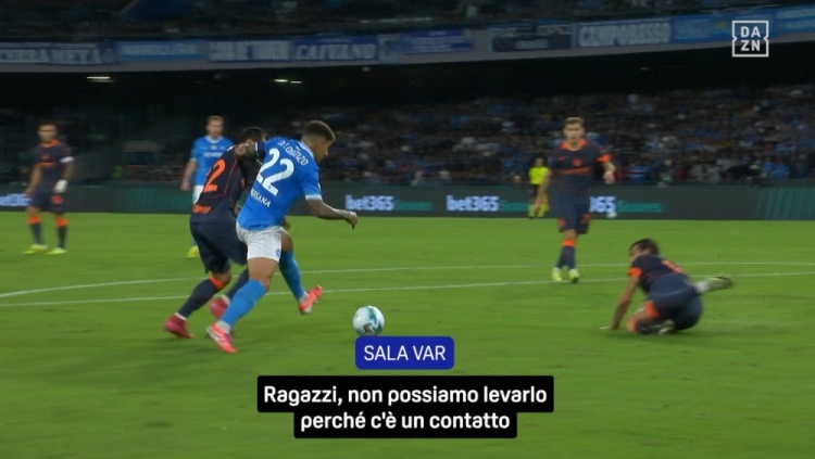 VAR: "确实,迪洛伦佐有介入,但他介入是因为一个动作……他并不是为了争取不属于球的空间而伸腿,而是为了保护球而伸腿。我们来看一下姆希塔良的动作,稍等。看看迪洛伦佐的脸,他正保护着球。稍等一下,我在核实。”