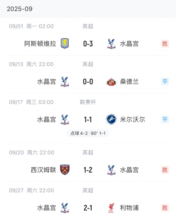 水晶宫在九月的五场比赛中保持不败,其中英超3胜1平,联赛杯通过点球大战顺利晋级,水晶宫还在月末戏剧性绝杀利物浦,成为当月英超唯一保持不败的球队。主帅格拉斯纳也成功当选英超9月最佳教练。