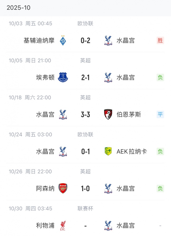 然而,进入10月的水晶宫状态下滑,先是英超不敌埃弗顿,此后还在欧协联爆冷输给塞浦路斯球队AEK拉纳卡,上周末又不敌阿森纳,周四的联赛杯,水晶宫将在联赛杯再战利物浦。