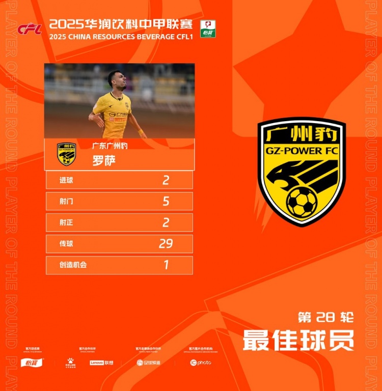 10月29日讯 中甲联赛官方公布了联赛第28轮最佳球员,广东广州豹外援罗萨当选。