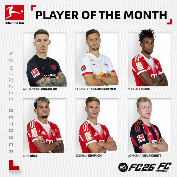 10月29日讯 今日,德甲官方公布了10月份联赛最佳球员的6名候选人,奥利塞领衔拜仁3将在列。
