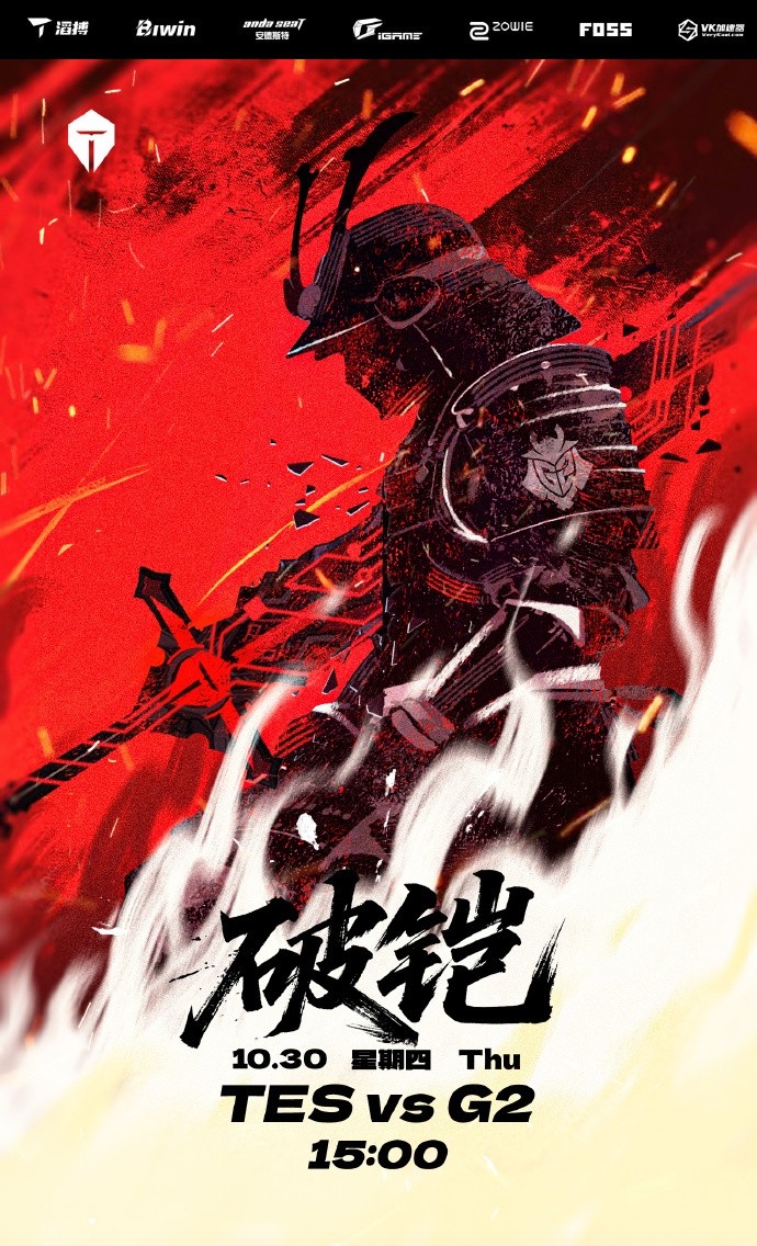 TES官方发布S15八强赛对阵G2赛前海报:破铠