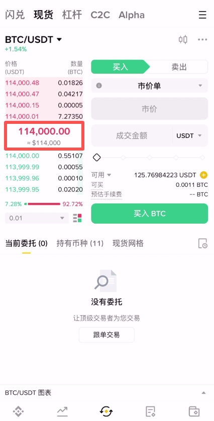 如果说看我们当前的市价,我们来到现货,可以看到实际比特币的价格只需要114000。
