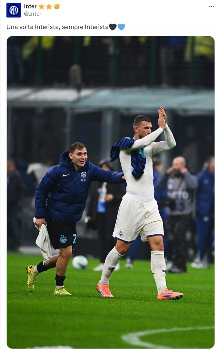 国米旧将哲科此役为佛罗伦萨替补出场,国米官方社媒晒出哲科的照片,致敬这位39岁的前锋,配文:“一日蓝黑,终生蓝黑。”