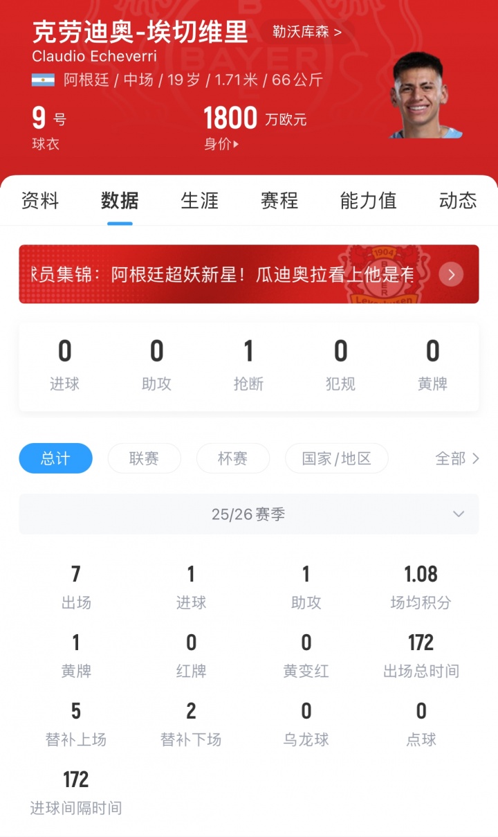 自2025年以来,埃切维里近11个月仅为俱乐部出战9场比赛,总出场时间不足200分钟。他的身价保持在1800万欧,自去年夏天以来从未发生过变化。
