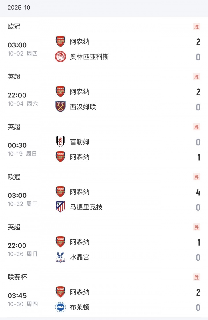10月30日讯 阿森纳刚刚度过了完美的10月,球队在在英超、欧冠、联赛杯赛场6战全胜,打入12球,一球未丢。