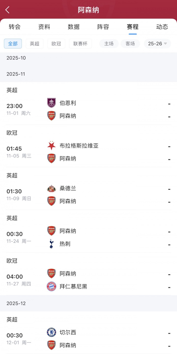 进入11月,阿森纳将首先迎来伯恩利、布拉格斯拉维亚和桑德兰的挑战,随后就是北伦敦德比和对阵拜仁。