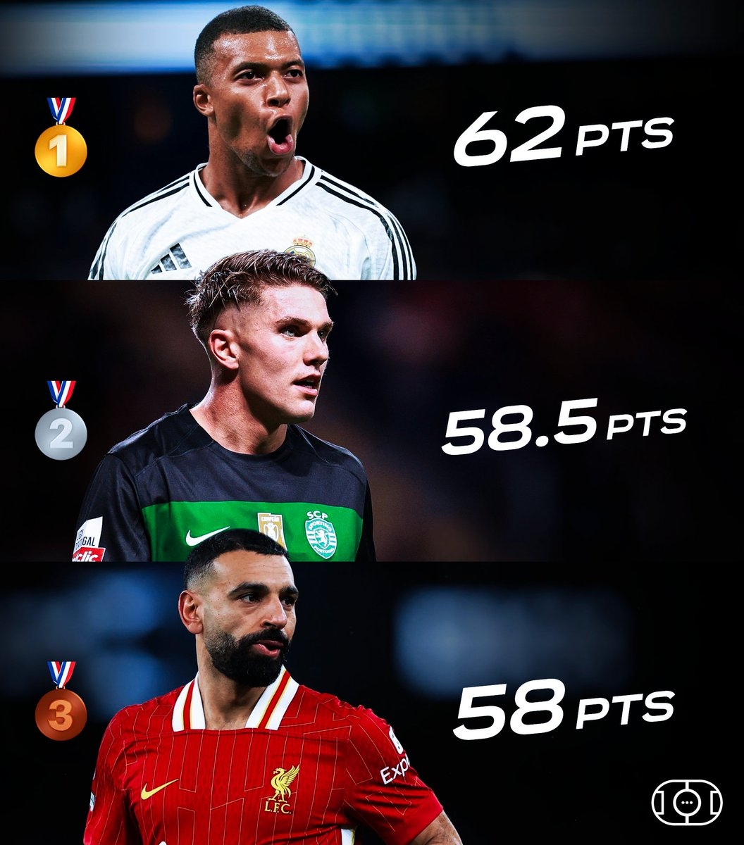 姆巴佩在2024/2025赛季西甲联赛中的31个进球为他赢得了62分。尽管约克雷斯在葡萄牙超级联赛中打入39球,但由于每球得1.5分,他最终以微弱优势落后于萨拉赫,后者以29球获得58分。