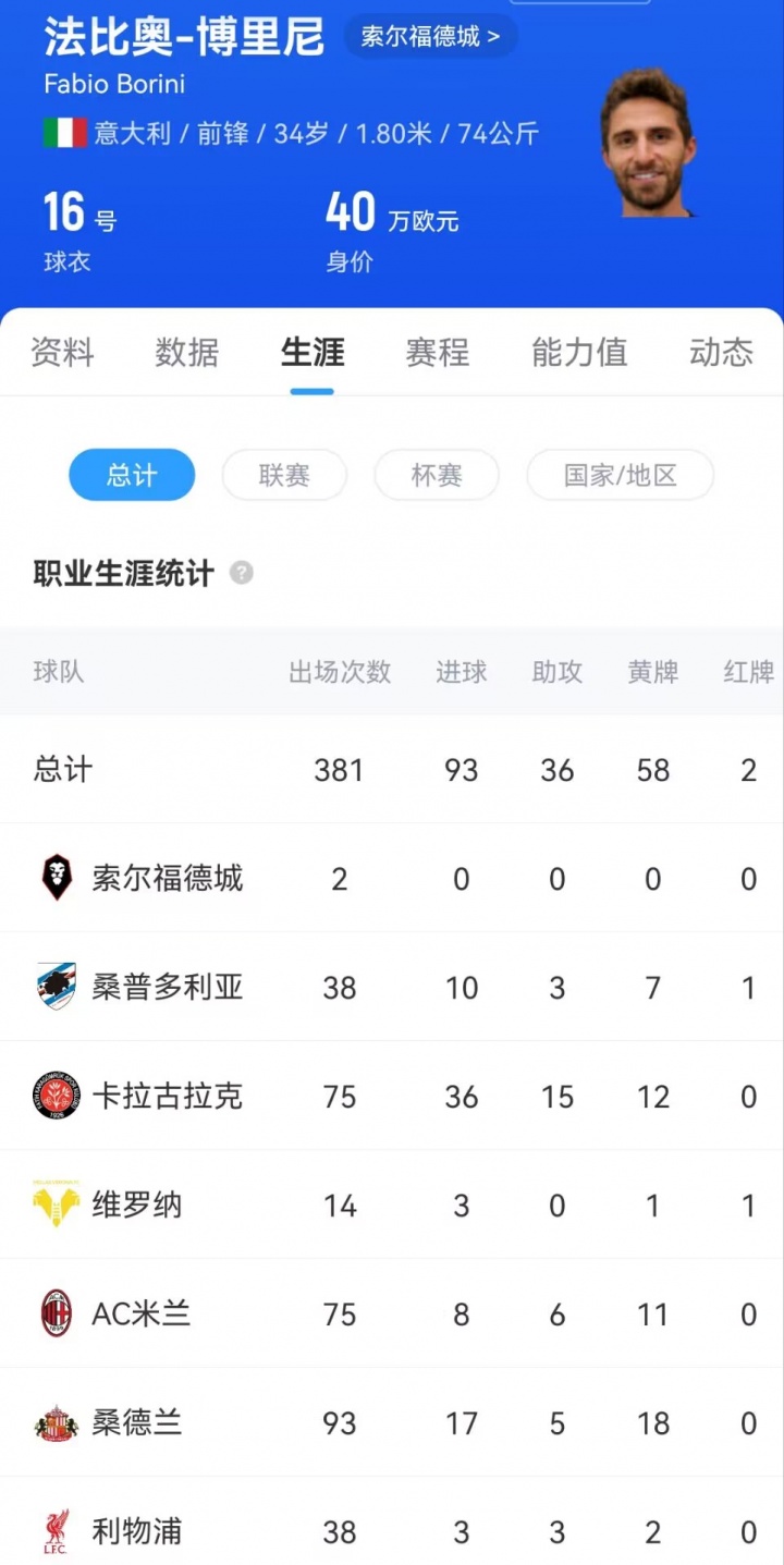 现年34岁的博里尼职业生涯曾效力于罗马、利物浦、AC米兰等队,职业生涯辗转多支球队;他在桑普多利亚效力了两年,仅上场38次。今夏,他成为自由球员并加盟索尔福德城,签下一份短期合同。