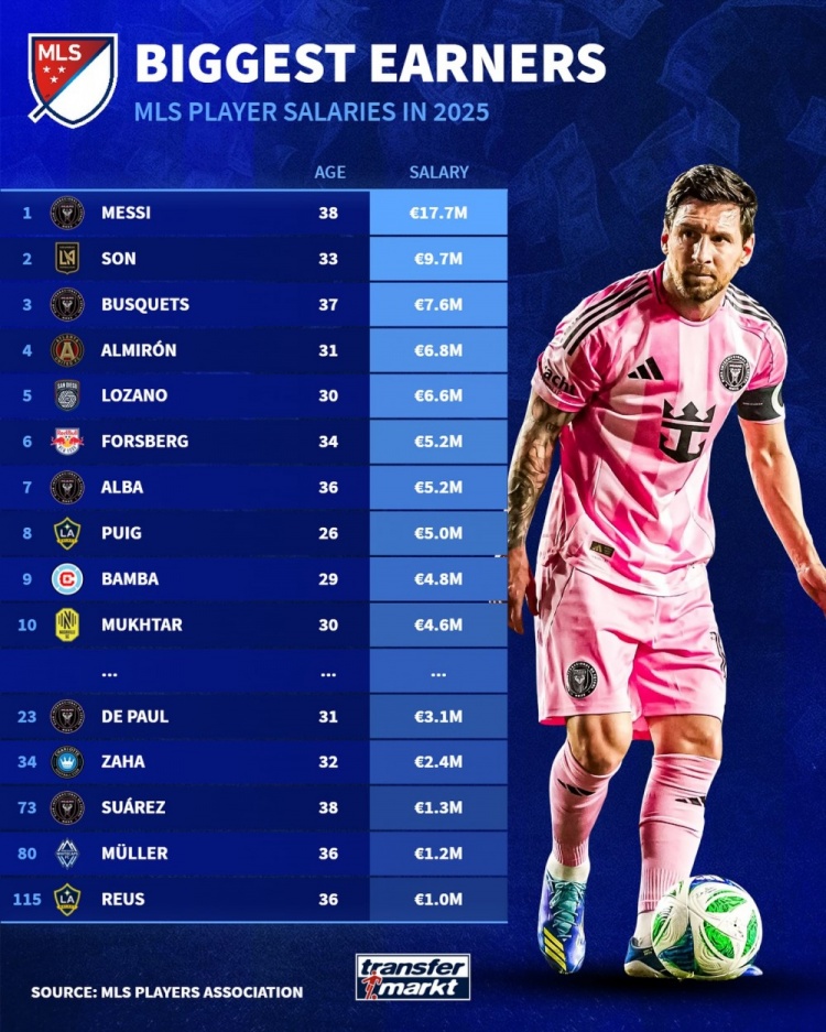 10月31日讯 德国转会市场统计了美职联球员的薪资,并列出榜单,梅西1770万欧断层居首,孙兴慜970万欧次席。