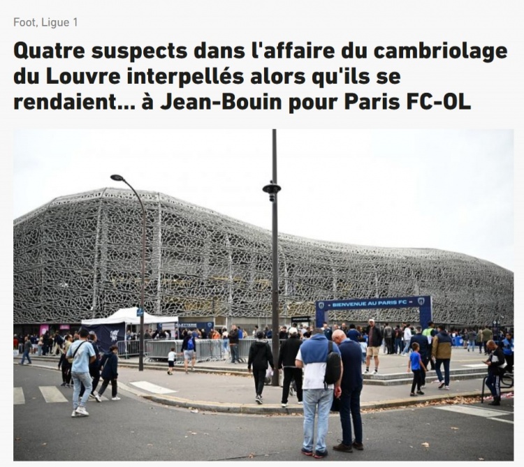 10月31日讯 据法媒报道,卢浮宫盗窃案有5名新嫌疑人被捕,其中4人被捕时正在前往让-布安球场观看巴黎FC和里昂的法甲比赛。