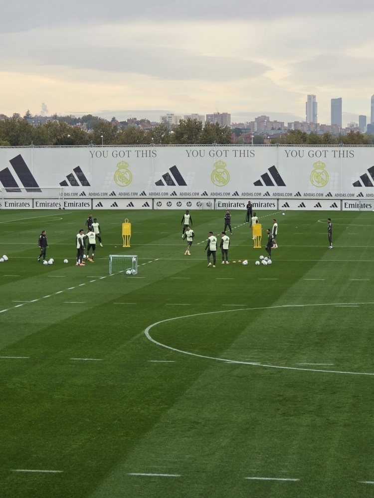 该记者透露:“皇马对阵瓦伦西亚之前的最后一次训练。卡瓦哈尔、吕迪格和阿拉巴缺席。小将弗兰-冈萨雷斯和梅斯特雷参与训练。”