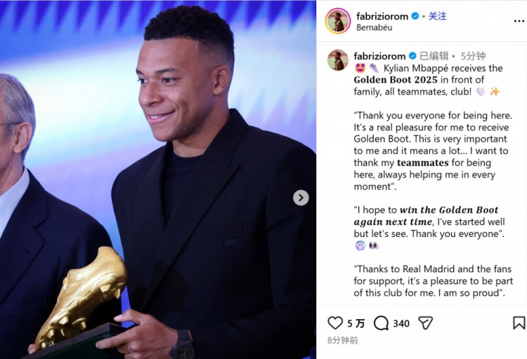 姆巴佩也发表了获奖感言:"感谢大家的到来。能够赢得(欧洲)金靴奖,对我而言是莫大荣幸,也意义非凡……我要感谢我的队友们,感谢他们一直陪伴在我的身边,始终给予我支持。"