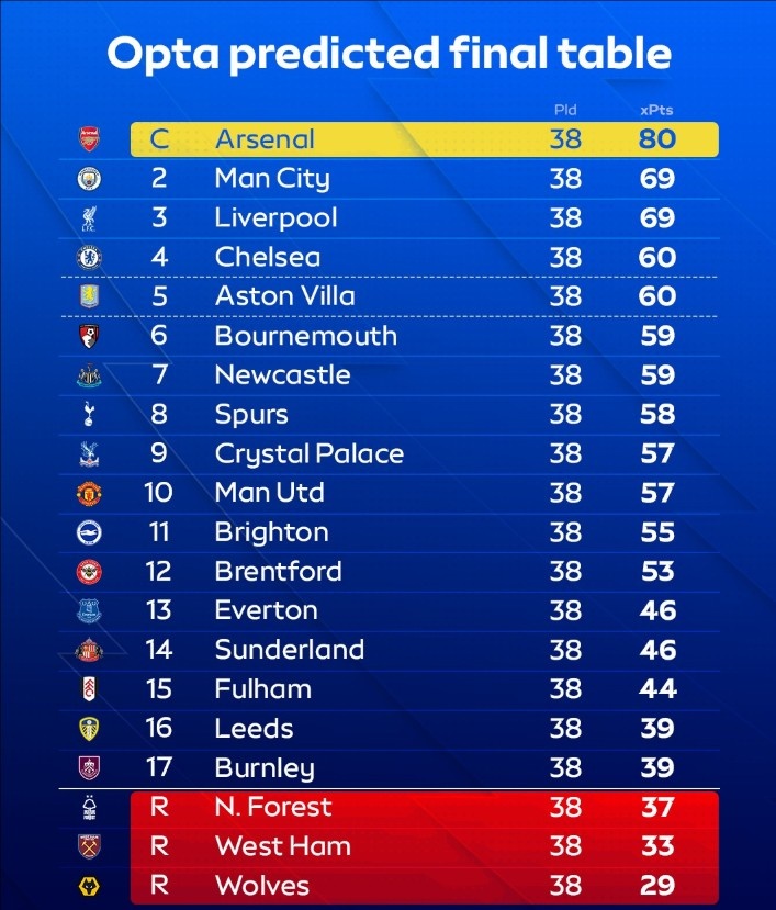 10月31日讯 Opta数据给出了最新一期的2025/26赛季英超联赛最终排名预测,阿森纳夺冠。