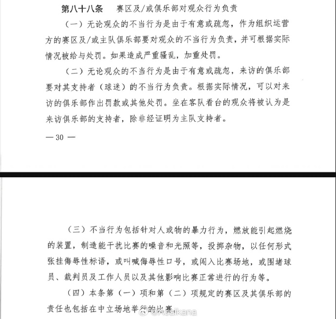 在今年新发布的中足联纪律道德准则里,“歧视”(包含种族、肤色等歧视行为)是专门增加的内容,这也是响应了国际足联严打赛场种族歧视行为的要求。此前,职业联赛种族歧视事件多发,由于缺乏相应条款或证据,结果多不了了之或以其他理由替代。但最新文件明文规定,球迷有歧视行为的,一旦证据确凿(一般指可供支持证明其行为的视频录像、人证、比赛官员的报告、听证记录等),其所支持的俱乐部将被处以至少50万元的巨额罚款,并将根据纪律道德准则进行进一步处罚(关闭部分看台或全部空场等)。