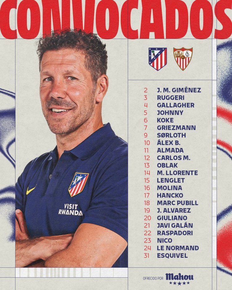 11月1日讯 在本轮西甲联赛的一场比赛中,马德里竞技将坐镇主场对阵塞维利亚,赛前,马竞公布了本场比赛的球员大名单,如下: