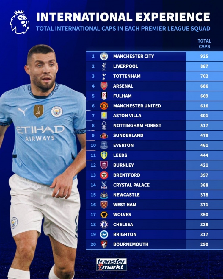 11月1日讯 德国转会市场统计了英超各队球员为国家队出战的场次,并列出榜单,曼城925场居首,利物浦887场次席。