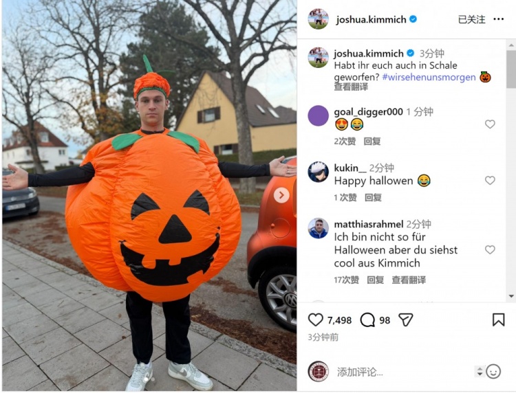 基米希装扮成鬼怪南瓜,他在社交媒体上晒出照片,配文:“各位今日也都盛装打扮了吗?”