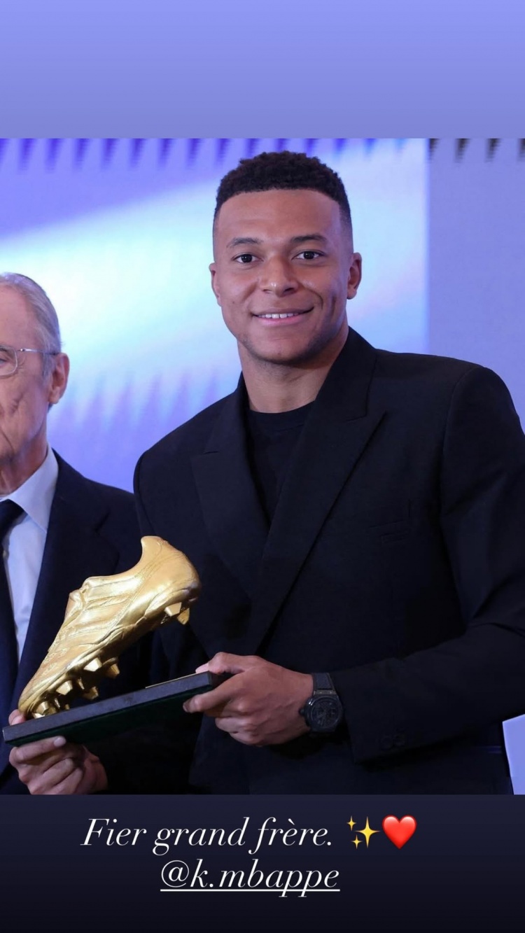 伊桑-姆巴佩社媒晒出哥哥领取欧洲金靴奖的照片,配文:“为你骄傲,大哥。”