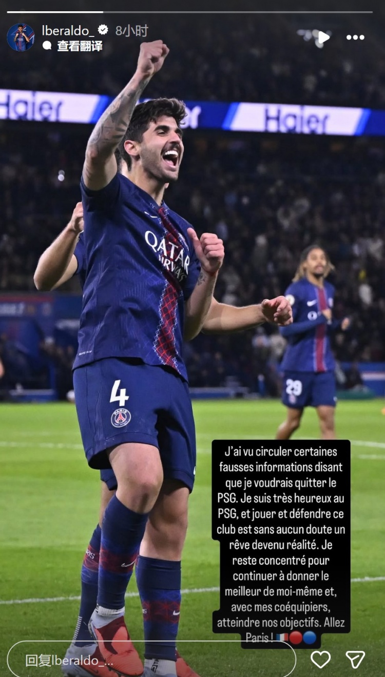 11月1日讯 巴黎后卫贝拉尔多更新社媒动态,辟谣离队传闻。