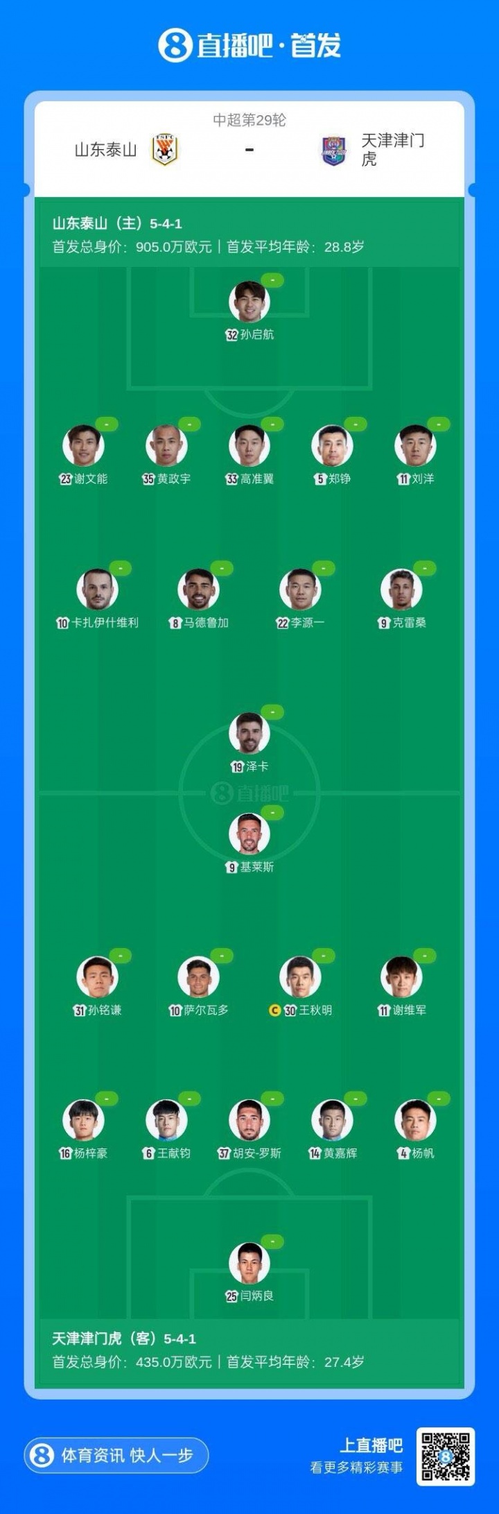 11月01日讯 北京时间今日15:30,中超第29轮,山东泰山主场收官战迎战天津津门虎。赛前双方的首发阵容出炉,泰山队外援路易斯因伤缺席,王大雷有伤无法出场,孙启航担任首发门将,这是他在泰山队一线队的首秀,天津队外援基莱斯、罗斯和萨尔瓦多首发登场。
