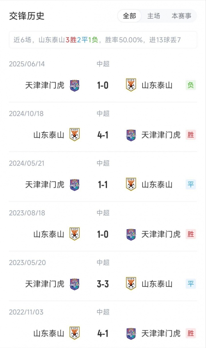 泰山暂列中超第5名,13胜8平7负积47分;津门虎紧随其后排在第6名,12胜8平8负积44分。