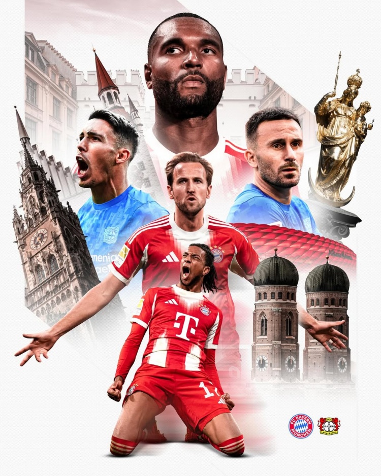 拜仁官方更新社媒动态,发布了为此役制作的海报,凯恩、奥利塞、若纳坦-塔出镜。