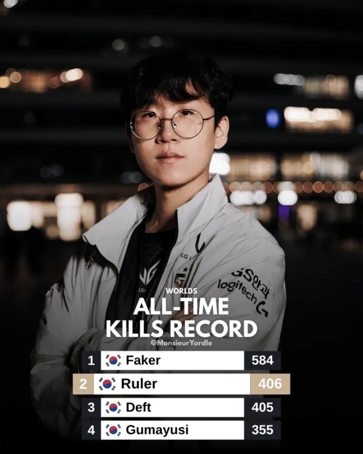 Ruler世界赛击杀数来到406次,超越Deft位列历史第二