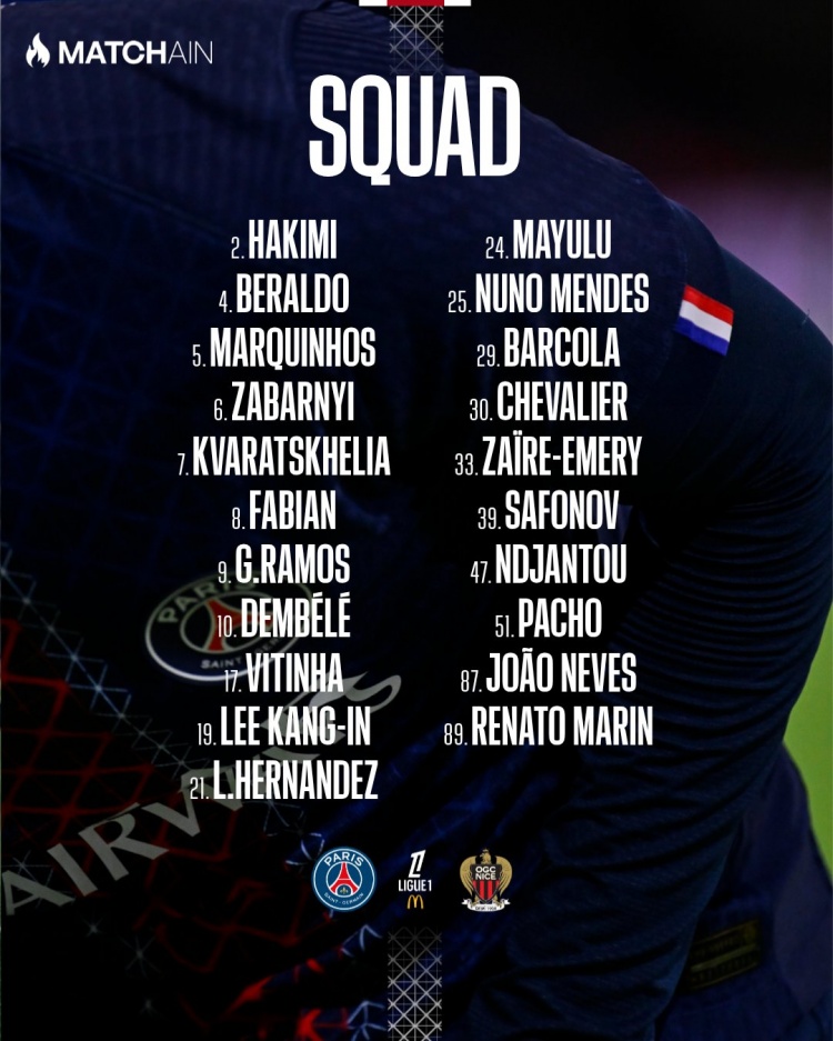 11月1日讯 北京时间明天凌晨,巴黎将在法甲第11轮比赛中主场对阵尼斯,巴黎公布了此役的球员名单,阿什拉夫、李刚仁、法比安回归,杜埃、姆巴耶缺席。