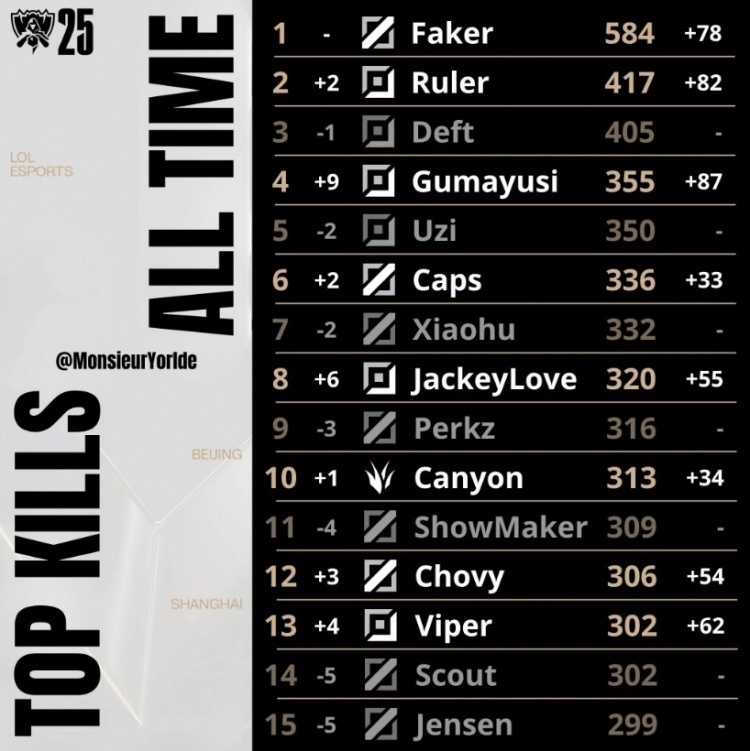 11月1日讯 外媒统计全球总决赛总击杀数榜单,具体如下: