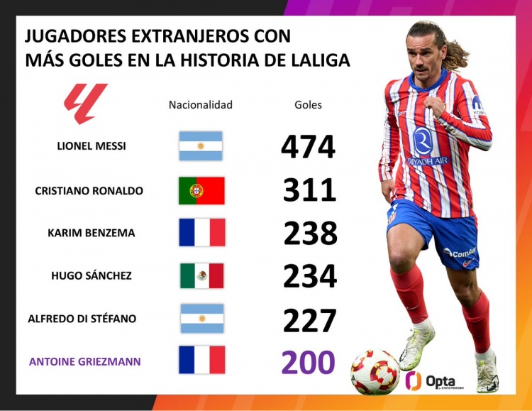格列兹曼是西甲历史第11位200球先生,同时也是第6位达此成就的外籍球员。