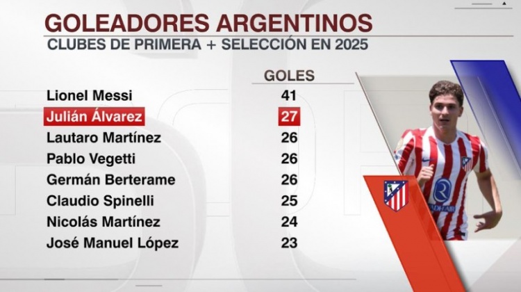 进入2025年,阿尔瓦雷斯在俱乐部和国家队已打进27球,阿根廷球员中仅次于梅西的41球。在阿尔瓦雷斯身后是劳塔罗(26球)、维格蒂(26球)、贝尔泰拉梅(26球)、斯皮内利(25球)、尼古拉斯-马丁内斯(24球)以及何塞-洛佩斯(23球)。