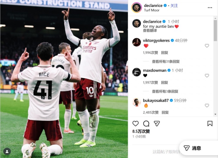 赖斯的姨妈贝芙近日去世,阿森纳中场用进球献给了自己深爱的人。