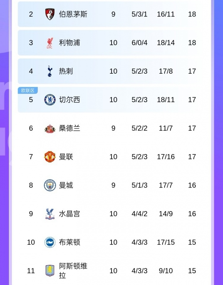 目前英超第2的伯恩茅斯距离英超第11的阿斯顿维拉仅有3分分差,10支队伍乱成了一锅粥。