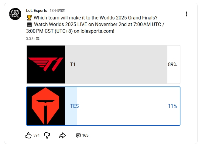 lolesports公布了对本场BO5的预测投票,有89%的网友认为T1将战胜TES,仅11%网友认为TES能赢。