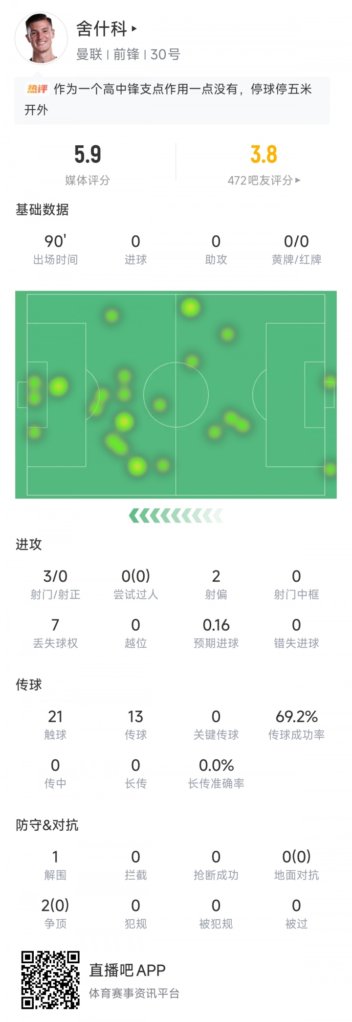 本场比赛22岁的舍什科打满全场,表现不佳,评分仅5.9分,低于6分的基础分。他的全场数据如下:3射0正0对抗,争顶0成功,21次触球7次丢球权,传球成功率69.2%。