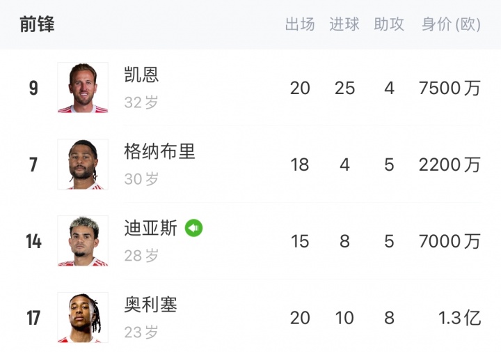 凯恩、迪亚斯、奥利塞本赛季数据↓