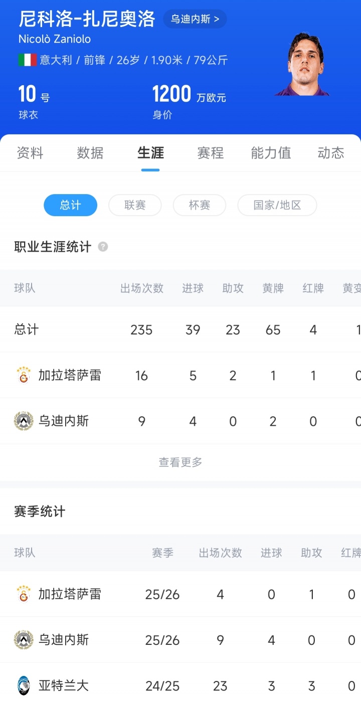 今年夏窗扎尼奥洛从加拉塔萨雷租借加盟乌迪内斯,赛季至今代表球队出战9场比赛,打进4球,已经刷新了个人近3个赛季最多的单赛季进球数。