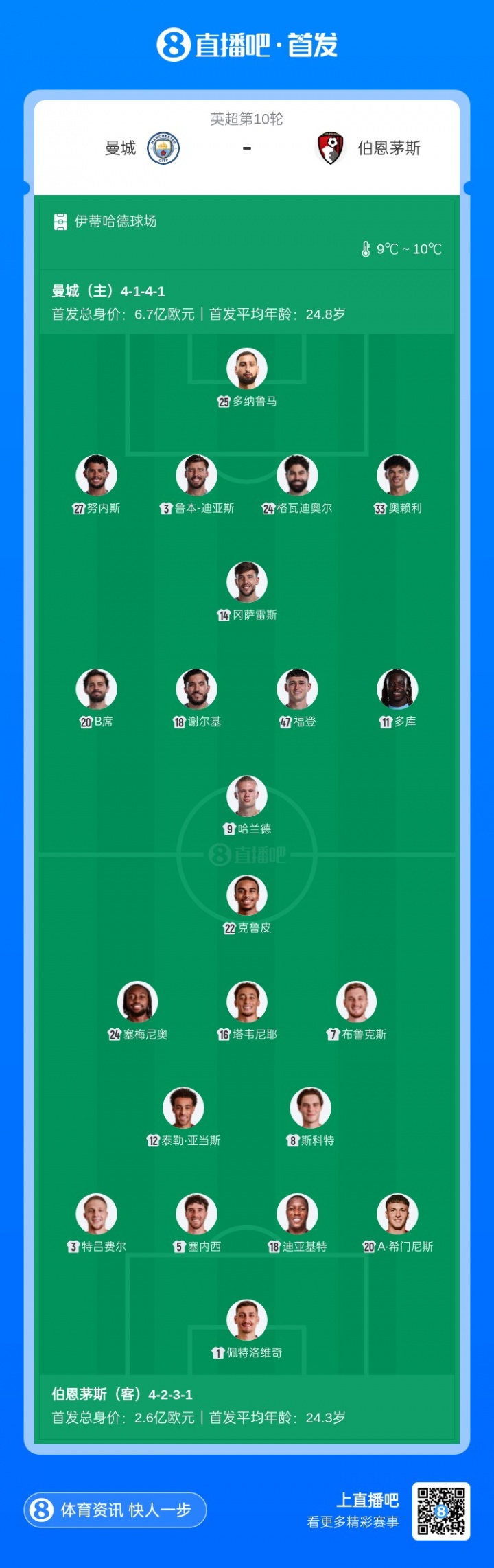 曼城首发:25-多纳鲁马、27-努内斯、3-迪亚斯、24-格瓦迪奥尔、33-奥赖利、14-尼科·冈萨雷斯、20-B席、47-福登、10-谢尔基、11-多库、9-哈兰德