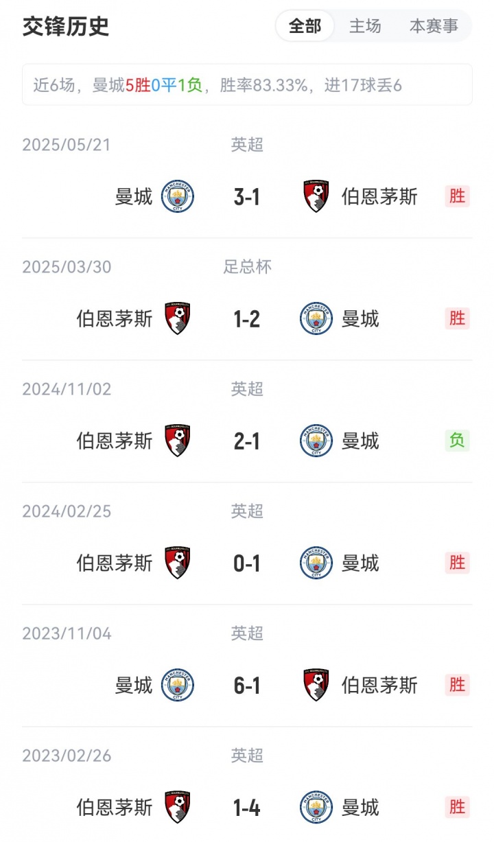 本场比赛前,曼城9轮5胜1平3负,积第16分排名联赛第6;伯恩茅斯5胜3平1负,积18分排名联赛第2。双方上次交手,曼城主场3-1战胜伯恩茅斯。