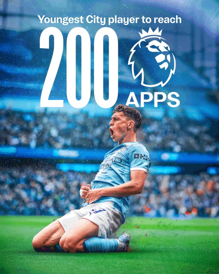 福登将以25岁158天的年纪超越斯特林(26岁284天),成为历史上为曼城出战200场英超比赛最年轻的球员。